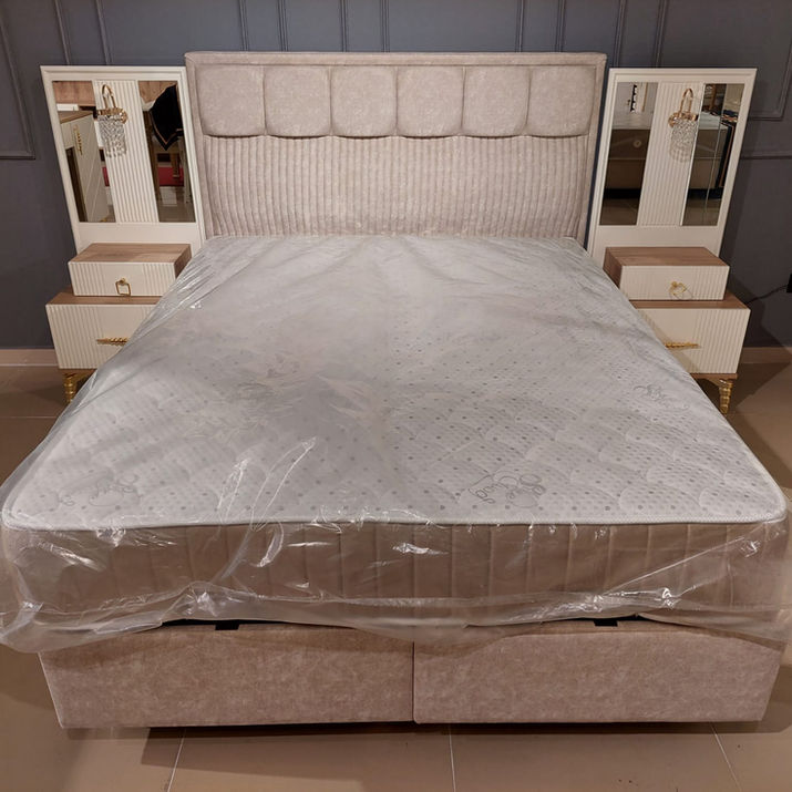 Yatak, başlık, komodin ve dolap içeren uyku odası mobilyaları.